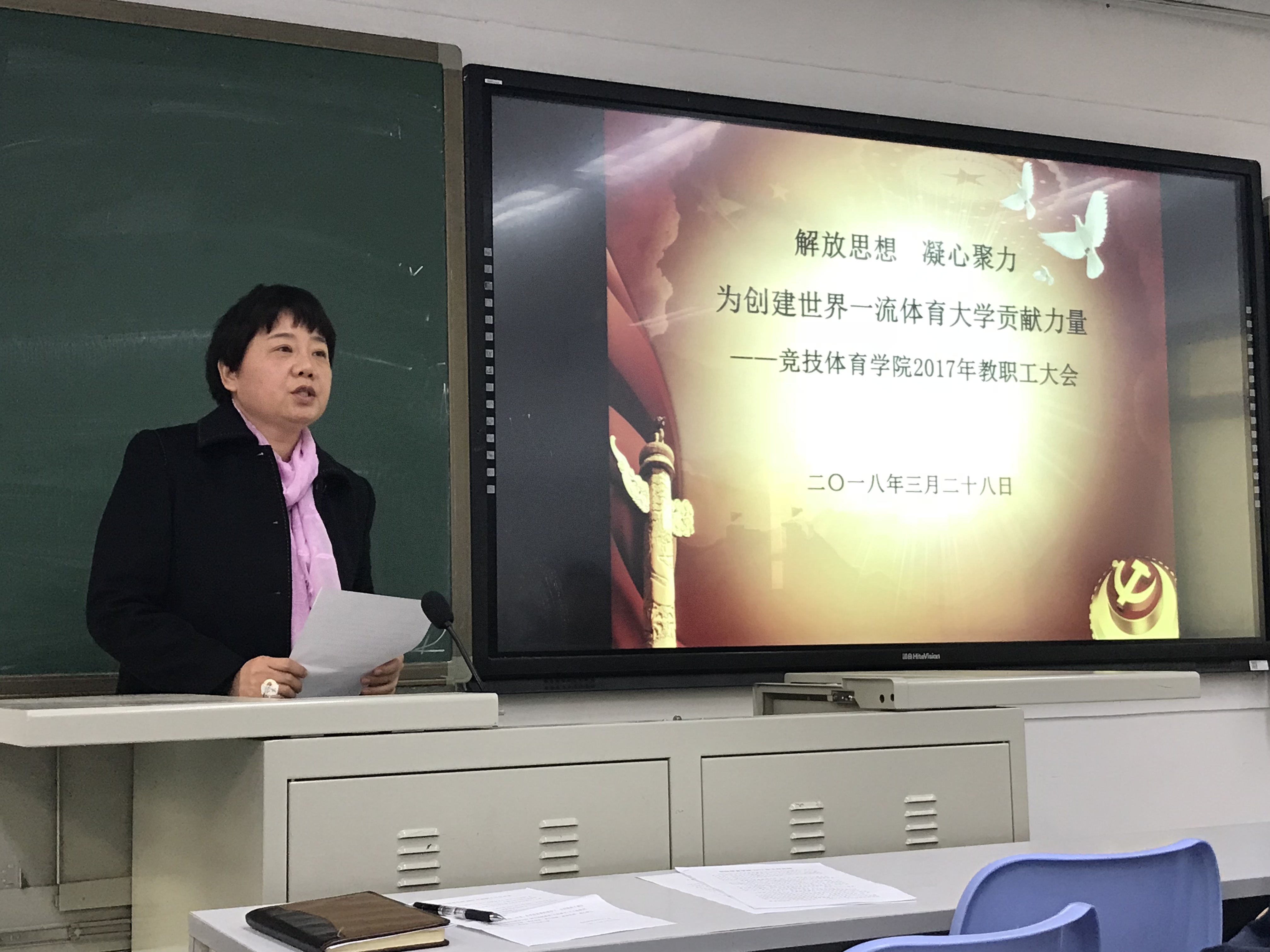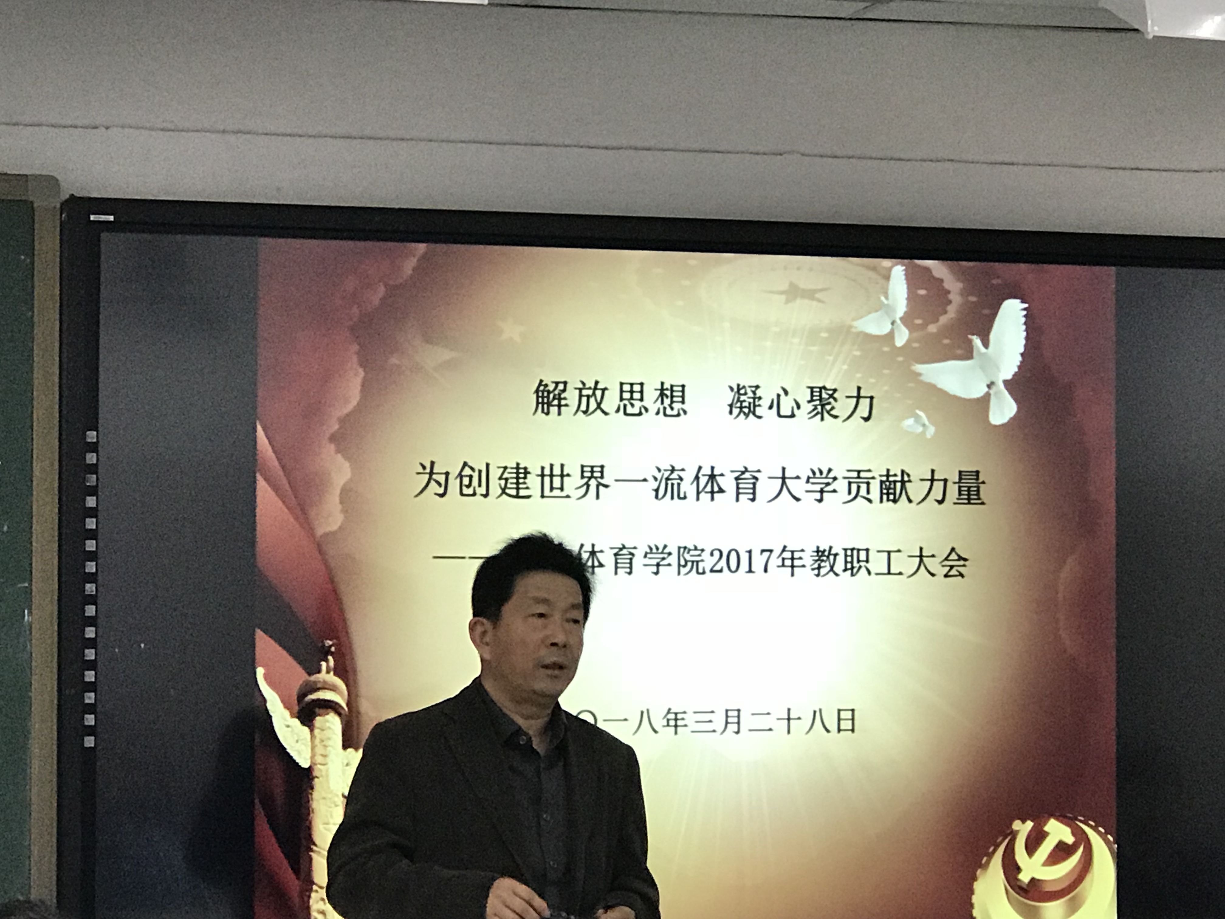 2018年3月28日,beat365vip官网登录入口召开了以“解放思想,凝心聚力,为创建世界一流体育大学贡献力量”为主题的教职工大会。学院分工会主席尚迎秋、院长马冰、副院长左琼及全体教师参加了会议。