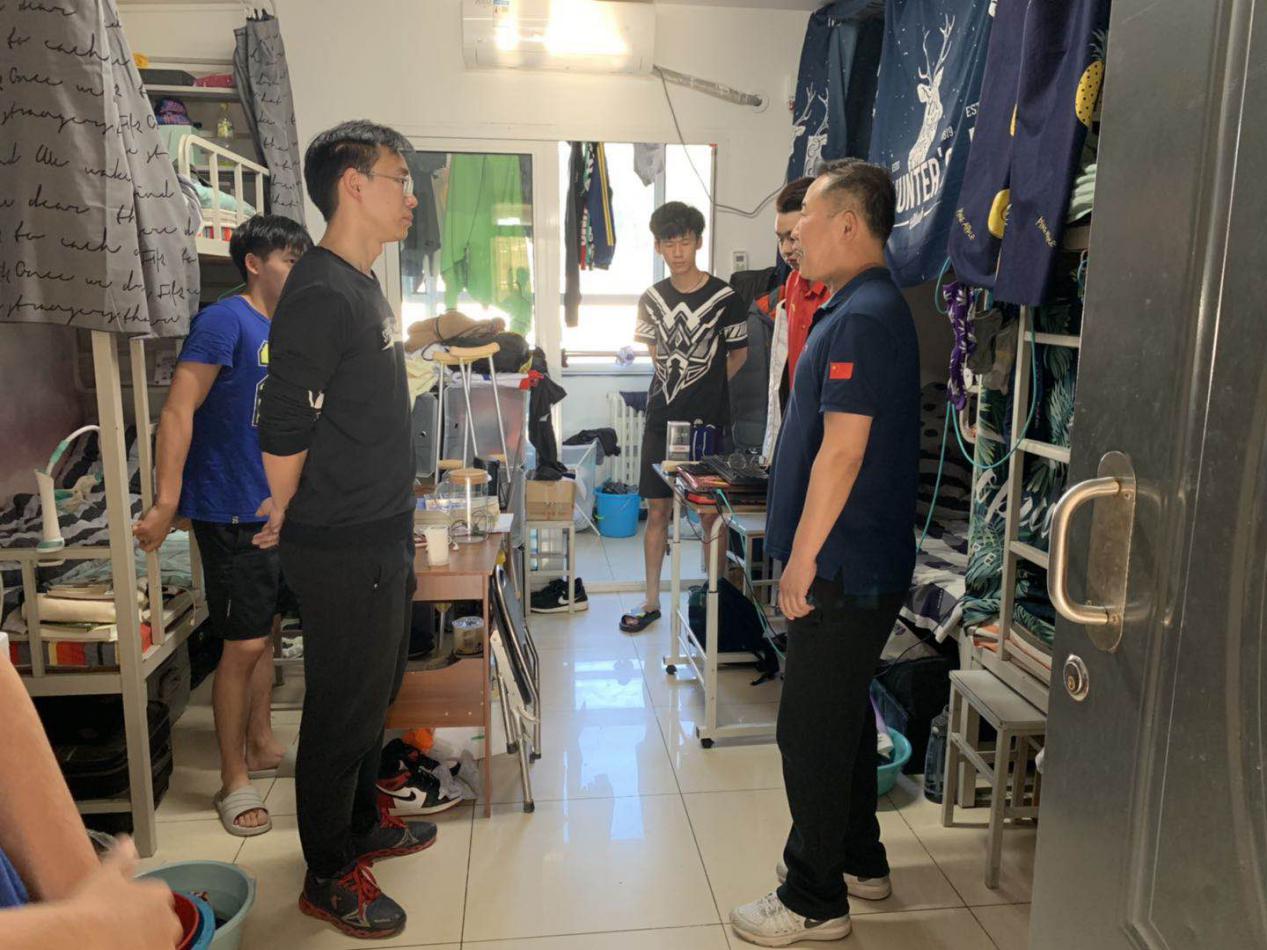为了全面落实高水平办学理念,提高学生管理力度,更全面了解beat365学生生活状况,2019年5月22日早晨,18级11班班主任、校保障处处长刘立峰老师和beat36518级辅导员李骁騉老师利用早操时间,深入9号学生公寓楼,对beat365vip官网登录入口18级11班男生寝室进行检查专访。