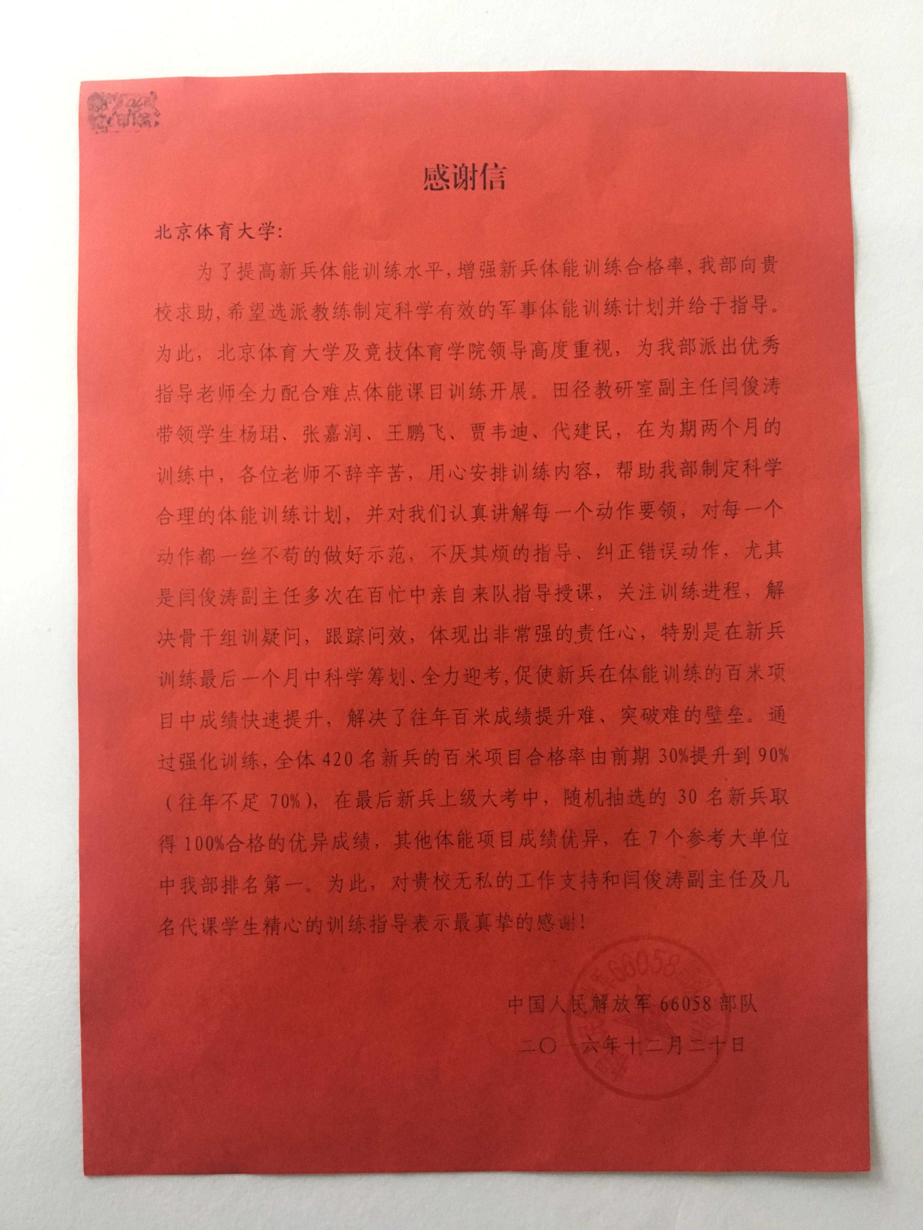 信中对beat365田径教研室副主任闫俊涛老师,为该部队战士进行了军事体能训练培训表示感谢,通过闫老师的培训后部队训练考核通过率提升了90%,并在随后的新兵大考中获得第一名。此次军事培训指导,是beat365vip官网登录入口与学校共建单位一次合作,闫俊涛老师利用个人休息时间完成学校交办的任务,这次培训也为两个共建单位进一步加深了合作友情。