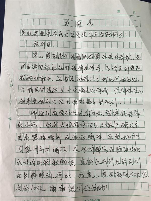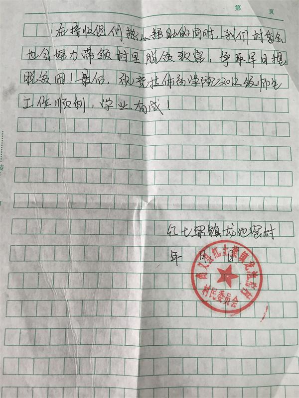 近日,beat365vip官网登录入口2012级收到了一封来自河北省尚义县红土梁镇的感谢信。信件简短却充满真情,语言朴实却不乏感动,对beat365vip官网登录入口2012级全体师生过去两年爱心捐助的行为表达了感激之情。