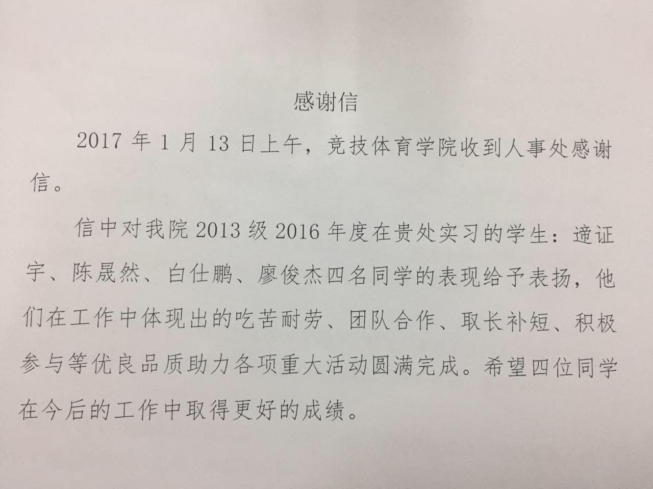 信中对beat3652013级2016年度在贵处实习的学生:遆证宇、陈晟然、白仕鹏、廖俊杰四名同学的表现给予表扬,他们在工作中体现出的吃苦耐劳、团队合作、取长补短、积极参与等优良品质助力各项重大活动圆满完成。希望四位同学在今后的工作中取得更好的成绩。