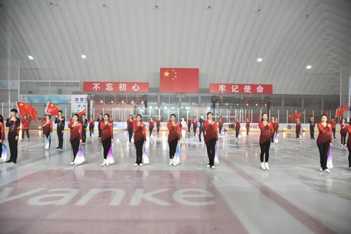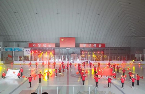 课程在冰舞表演《走进新时代》中拉开序幕,张昊带领冰舞实验班学生伴着音乐翩翩起舞,晶莹冰面与旗帜光影交相辉映,展示出学校全面深化教育教学改革的新举措新成绩和学校师生的新时代新风貌。