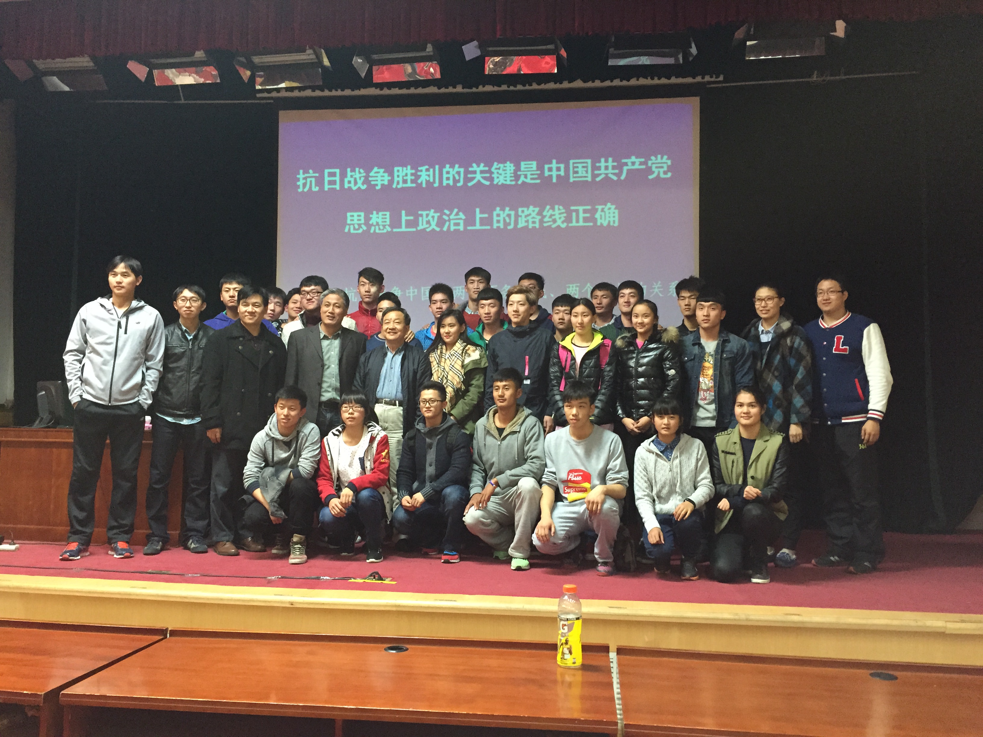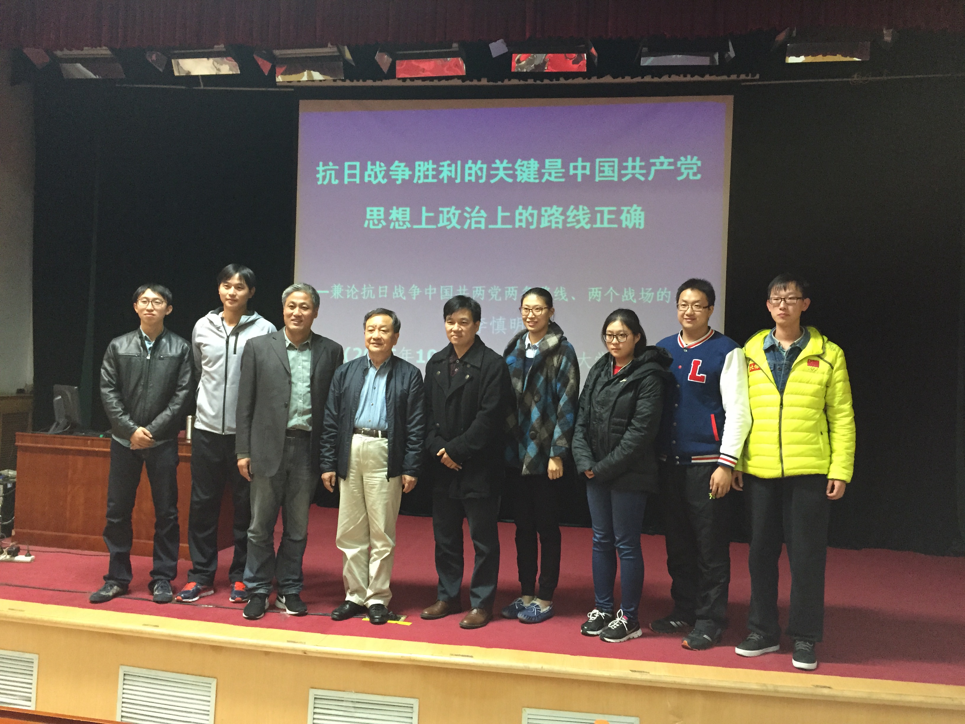 首先,他向同学们介绍了纪念抗战胜利70周年的国际国内背景,分析了我国现今面临的机遇与挑战。其次,他指出制定正确政治路线的重要性,并解释了中国共产党在抗战时期所执行的政治路线的正确性。随后,他谈到了正确的思想路线是正确的政治路线的根基。他说,共产党思想路线的体现是认真学习马克思主义,依靠人民群众实现逐步实现共产主义社会。最后,他讲解了“从国共两党在不同战场上的不同作用看中国共产党思想、政治路线的正确性”的问题。