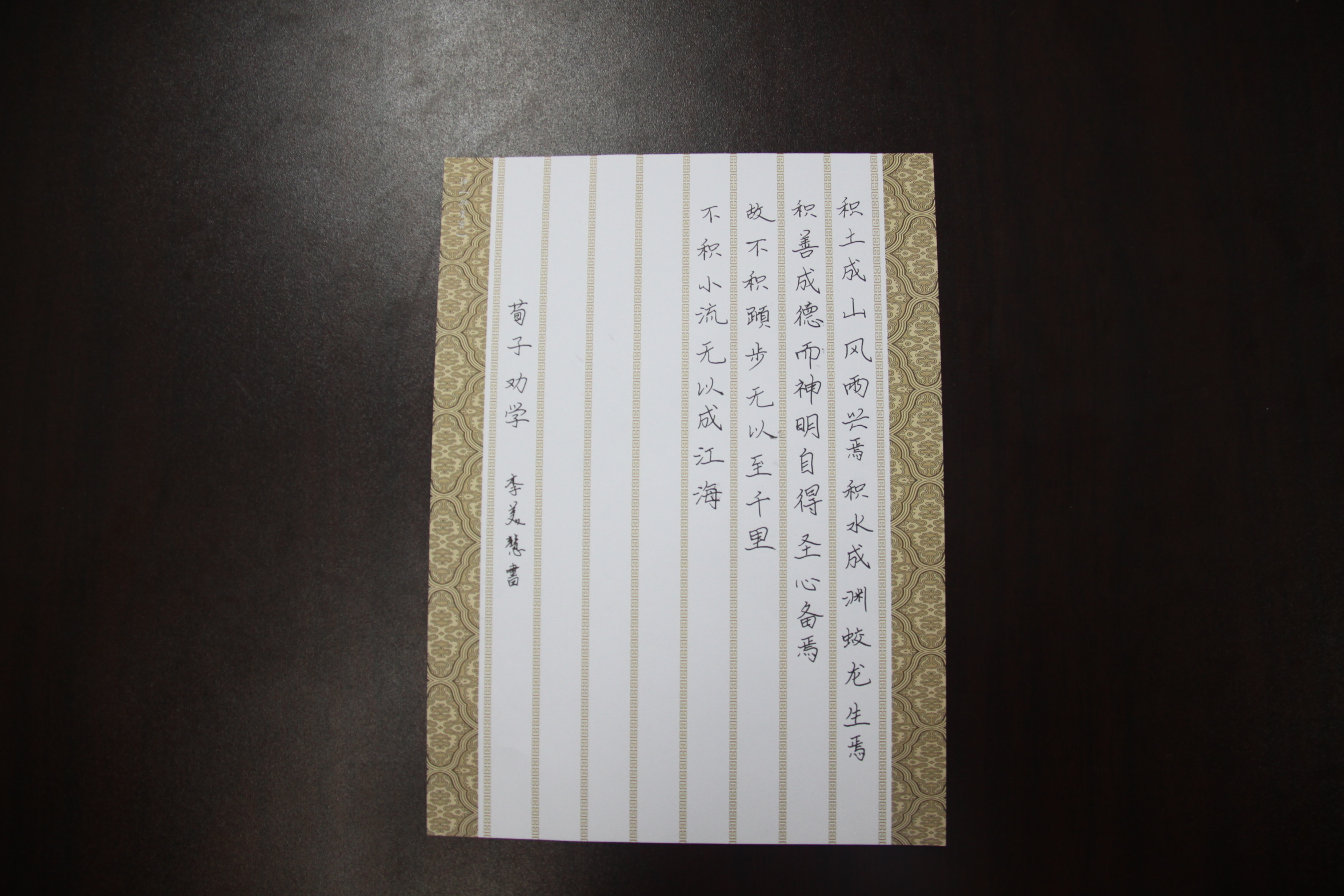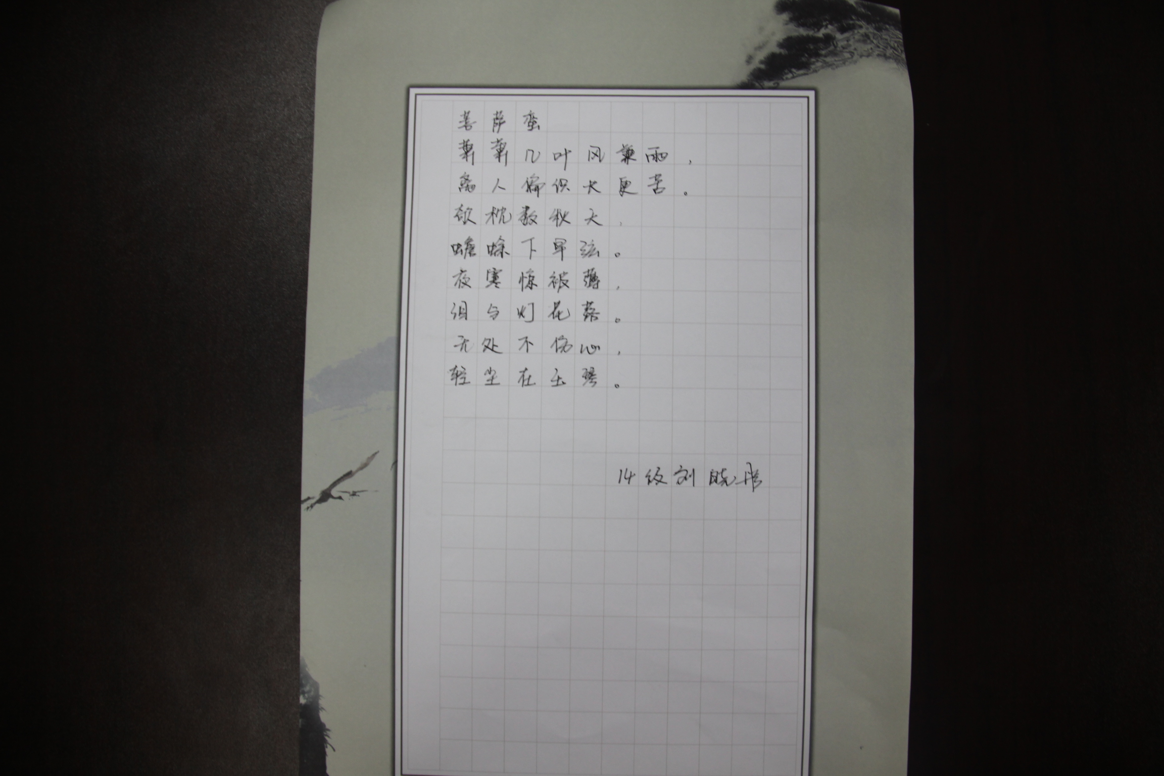 本次比赛内容为硬笔书法,大赛首轮以一首磅礴大气的《沁园春·雪》作为主题。比赛开始后,选手们奋笔疾书,纷纷散发出“龙威虎振,剑拔弩张”的气势。在书写诗词的同时,选手们也被这词中“山舞银蛇,原驰蜡象,欲与天公试比高”的雄阔豪放意境深深感染。通过首轮的角逐,有六名选手进入第二轮。第二轮比赛为选手自选题材,充分展现了选手们的书法功底。最终,来自2013级的李美慧力压群雄夺得此次书法大赛的第一名。