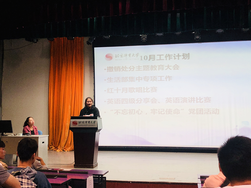 会议伊始,辅导员李显老师对开学以来的各项工作做了总结,并对即将开展的“我和我的祖国”主题活动、纪律部主题教育大会、英语四级分享会和英语演讲等工作做主要部署安排。会中,辅导员李显老师公示了2018级学生干部换届选举名单并颁发聘书,希望学生干部在今后学习中,以身作则,起到模范带头作用,在其位谋其职,也请全体学生监督学生干部的工作。听到李老师的总结以及对常规的各项要求,各位学生干部表示今后,一定严于律己,协助老师将各项工作做好。随后,李老师学生关注的评奖评优细则问题进行解读,强调三好学生评选工作是根据学生的综合表现评价的,旷操旷课迟到早退这些细节问题不注意,只关注学习成绩是不足够的,要做到在各方面做到严于律己,细节决定成败,提升个人修养和言行。最后,辅导员李显老师对本次大会作简单总结,希望在今后的学习和生活中,同学们能够珍惜时间,保持初心,奋力前行。